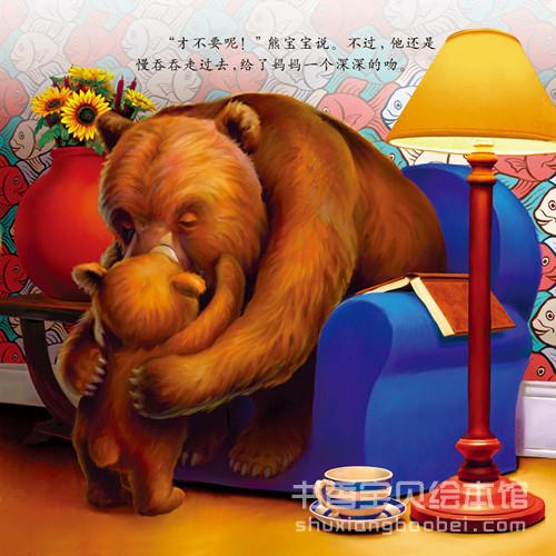熊爸爸来催促了,熊宝宝才勉强给妈妈一个晚安吻,可是,等到熊爸爸来要熊宝宝的晚安吻时,熊宝宝把爸爸推开了,坚决不给。