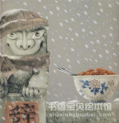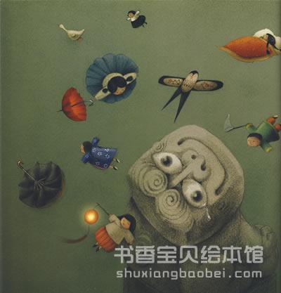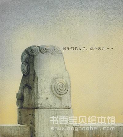 《小石狮子》虽然不是以毛笔绘制的水墨画,也不留“白”,但画中苍茫的感觉以及空间布局安排近似图画风格,故事极为简单且留下回味的余韵,又抓住了西方图画书的明快精神。故事是小镇里一座雕刻小石狮子的自述,一开始以三幅图逐渐拉近镜头特写小石狮子的脸部细节。