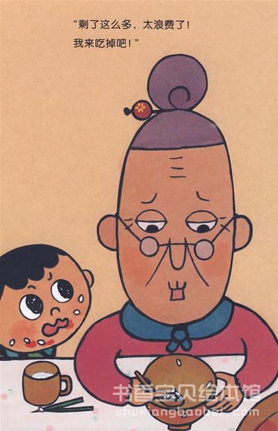 令人印象深刻的是,怕浪费婆婆的形象极具特色:旧式的衣服、拢起的发髻、圆圆的老花镜、细细的小拐棍,还有眼角的皱纹、努起的小嘴……俨然一位现实生活中的婆婆;她的眼神、表情和动作,都充满了固执、唠叨、朴实和孩子气……¬正是这样一位婆婆,打动了我们,在不经意间把勤俭节约的观念植入了小读者的内心。