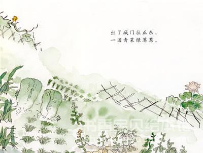 《一园青菜成了精》巧妙地蕴藏了青菜们的特性,这是一种充满智慧的幽默。小葱青秆绿叶儿长得直,正像一根银杆枪;韭莱的叶片狭长而扁平,如同两刃锋。大蒜成熟后的裂瓣,辣椒的浑身红通通,茄子的紫涨圆滚,都成了战斗的结果,让人读出意料之外却又不得不信服的荒诞。写到莲藕时,不是说它天性生长于湿泥里,而是成了逃跑不及的败军之将,糊里糊涂,慌不择路地钻进了烂泥坑——孩子们怎能不笑出声儿来呢。好的童谣需要好的画面来表现,增一分则太闹,减些许就平淡无奇。画童谣类的作品,一定要走进和它同步的韵味儿中,丢掉华丽虚假的习气,踏踏实实浸润到泥土里,才能相得益彰。我翻开书页,看到青莱萝卜们的神气活现和眉飞色舞,已然开始窃喜了。画家遵循着青菜们的独特个性,又赋予其饱满的情绪和孩童的顽皮,夸张却不鬼怪离奇,让这一群顽童煞有介事地摆开阵势,斗得畅快淋漓。仔细阅读的人是能够享受多种乐趣的,不但谐趣的画面可以养眼,还有更多的细节来给人逗乐儿。你看,同是那一片绿葱葱的莱园子,天亮后,你可发现了莱精们疏漏的小小破绽?抑或,你信不信还有更神奇的剧目在等待着你?快看封底上“扑哧扑哧”跃出的憨鸭、鱼儿和青蛙——又一场好戏即将开演啦!
