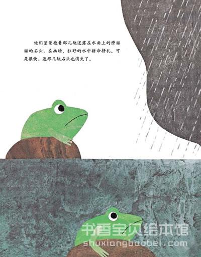 彩虹池塘中央的小岛上,住着三只自私的青蛙,他们一天到晚不停地争吵,生怕对方占了便宜。有一天,暴雨来袭,小岛即将被吞没,他们挤在一起,共同面对困难。洪水退去之后,青蛙们不再吵闹,而是一起玩耍,一起分享快乐……