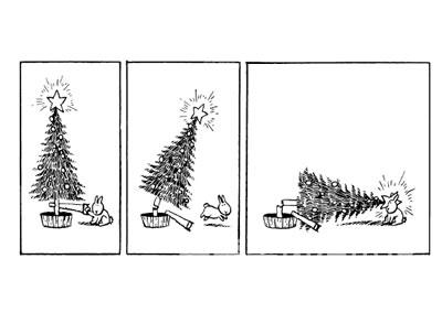 一脸无辜的小白兔千方百计地寻找结束生命的方式,它躺在电熨斗下,然后打开电源开关;它坐在滑板上,跟旅鼠一起冲下悬崖;它坐在食人鱼缸里慢慢等待;它迎大白鲨而上;它把硫酸倒进浇花的喷壶里,自己冒充向日葵;它对着许愿井许愿,希望自己早日归西;它设计了无数个连锁反应装置,目的都是为了结束生命……