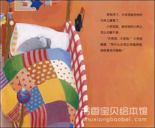 《小老鼠的漫长一夜》是一本给成长中的孩子的书。夜已经很深了,大老鼠早就在他的大床上睡着了。可是,小老鼠却在小床上怎么也睡不着。他躺在床上听着外面的声音。呼拉呼拉——,是不是有什么东西在跑呢?啪啪啪啪,是不是屋顶上有小偷?呜呜—呜呜—,是不是屋子里有鬼要来抓我?“我能不能到你的床上去睡啊?”小老鼠问大老鼠。可是,大老鼠总是不答应……