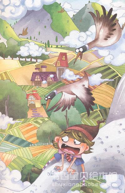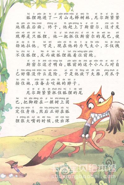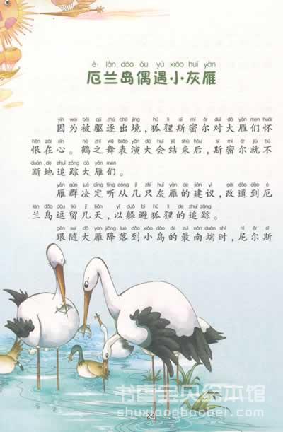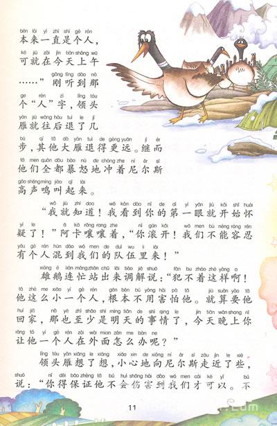 淘气的小男孩尼尔斯被小精灵变成了一个非常小的小人儿,他乘着大白鹅,跟随大雁群到许多地方去游玩。