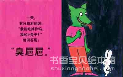 《臭巴巴》小兔子一开口只会说一句话——臭baba,就连遇到了大灰狼也是这样,更令人惊讶的是,吞掉了小兔子的大灰狼也只会说这一句话了……儿童的情态、儿童的语言、儿童的幽默,这个简洁明快的小故事充满了童心童趣的精彩。