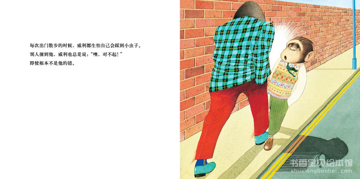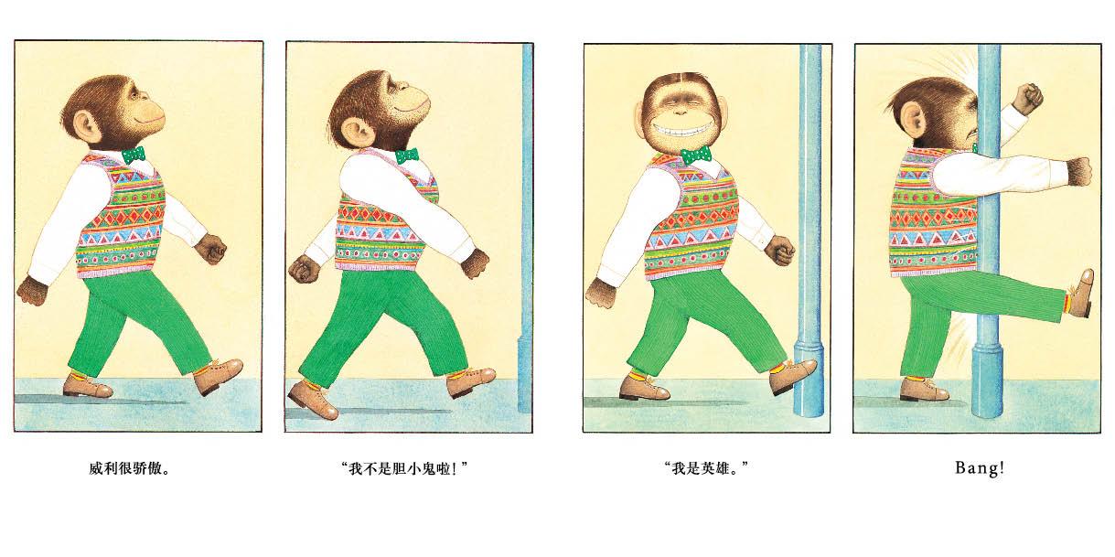 回看威利的故事,那意料之外、情理之中的结尾在小小的画框中戛然而止,为整个绘本增添了绕梁的余音、无穷的回味。在这里,也许是编者的画蛇添足:从胆小鬼到威武的英雄,不仅需要身体上的强壮,更要靠内心的坚定和自信。而不管怎样,威利都是我们心里可爱的他——我们爱能吓跑小混混的威利,也爱温柔善良的威利,孩子们的笑声一定会证明这一点。当然,让他们懂得锻炼身体也是很有必要的呀!