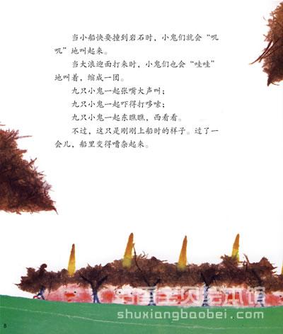 蒲蒲兰出的适合大龄孩子的一本绘本,九只小鬼竟然是从蛋里孵出来的,而且他们性格各异,有爱哭鼻子的,有爱欺负人的,有勇敢的,有爱生气的……而且不同性格的小鬼就喜欢和自己性格相同的小孩。到最后,春天江流里的那只树叶?船中只剩下了爱哭鼻子和爱生气的小鬼,他们还有寻找和自己性格相同的小孩子呢。看完了我问锐锐:“让那两只小鬼来和你做朋友好吗?”“不!我才不爱哭鼻子,不爱生气呢?”“那你要哪只小鬼做朋友?”“我要勇敢的小鬼和聪明的小鬼。”呵呵。好坏孩子心自知啊。