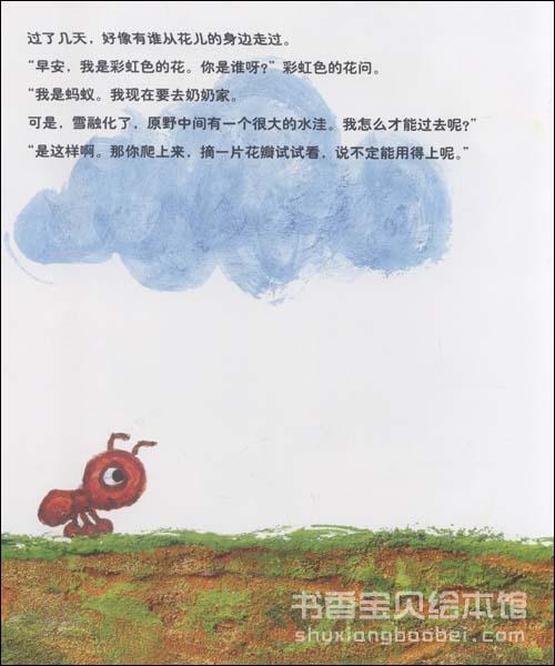 蚂蚁、蜥蜴、老鼠……小动物们各怀心事一个接一个地经过花儿的面前。花儿每次都热心地帮助他们、很慷慨地把自己的花瓣送给他们。随着季节的变换,彩虹色的花慢慢凋零,被掩盖在白茫茫的雪地下。虽然她离开了,却给大家留下一片温情。冬去春来,生命轮回,乐于助人的精神会存留其中,给读者留下无穷的回味。
