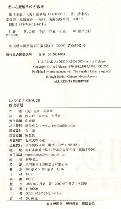 阅读是孩子了解自然与社会、获得知识和经验的主要方式。有关资料证明,早慧儿童的共同特点之一就是喜欢阅读。阅读能够激发孩子的学习动机和阅读兴趣、提高孩子的语言能力,是孩子智慧发展的钥匙。如何让孩子学会阅读并爱上阅读,给孩子朗读是一个最简单易行的方法。美国著名的阅读专家吉姆·崔利斯在《朗读手册》中用具体、生动、可信的案例,帮助家长、老师解决阅读指导中可能出现的各种问题,如“什么时候开始教孩子读书”、“怎样的书籍才算是好的朗读教材”、“孩子喜欢看漫画是好还是不好”、“如何建立一个好的家庭图书馆”、“如何在书籍和电脑之间取得平衡”、“该如何妥善处理电视问题”等。