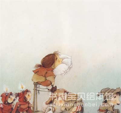 隔天晚上,她就偷偷在地板上撒了些豌豆。当黑夜又来临时,小矮人们轻悄悄地来到了......但是当他们踩在豌豆上时,一个接一个摔得四脚朝天,然后又在从楼梯上滚了下来。
