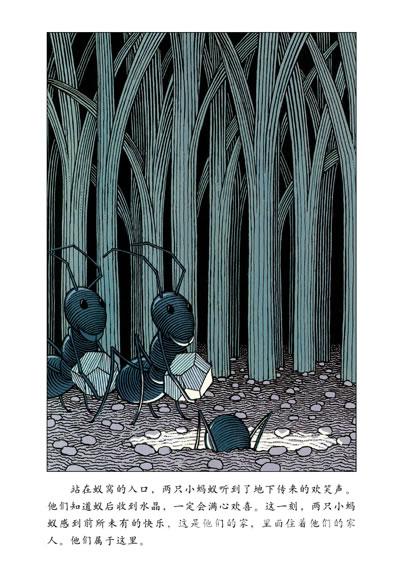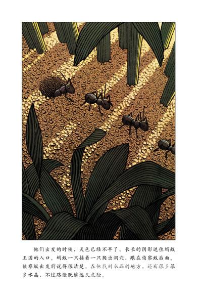 这是一本想象力丰富的图画书,当我们跟孩子共读这本书之后,不禁也想到去室外,蹲下来,看一看那些在石缝草间匆匆而过的蚂蚁?想象一下它们从哪里来,到哪里去,心里想的是什么。在美国,这本书非常受到孩子们欢迎。站在一个小孩的角度看,它为我们讲了一个情节相当连贯完整,有着起伏转折的故事。故事一开始,范奥尔伯格就用一句话,带我们进入了蚂蚁的世界:“消息在蚂蚁王国的坑道里传得很快。一只侦查蚁带着了不起的新发现回来,是一颗美丽耀眼的水晶。”随后,跟随作者的描述,我们走过蚂蚁小分队走过的路线,一直进入我们人类眼中平平凡凡的厨房,让我们感觉自己就是那两只蚂蚁,在巨人般的人类世界中历险。这样的角色转变和环境对比,为我们幼小的读者带来一种新鲜刺激的感受。