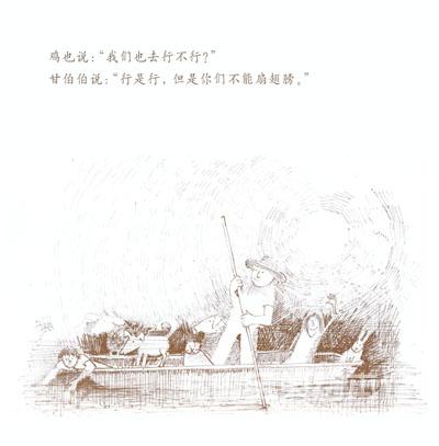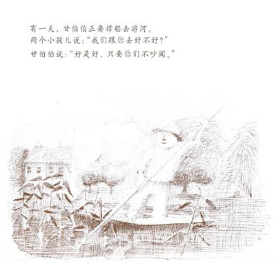 《和甘伯伯去游河》是约翰•伯宁罕的作品,他构思的是一个非常单纯的故事,单纯的感觉像一个幼儿:甘伯伯有一条木船,他的家就在河边。有一天,甘伯伯撑船去游河。两个小孩子、兔子、猫、狗、猪、绵羊、鸡、牛和山羊,一一要求上船。起初情形还好,后来这些乘客都忘了遵守秩序,忘了坐船的规矩。结果,船翻了,大家都掉进水里。甘伯伯带领大家游泳到岸边,让太阳把他们的衣服和身子晒干。和气的甘伯伯还邀请这批乘客到他家去喝茶,并且提议过几天大家再来坐一次船。