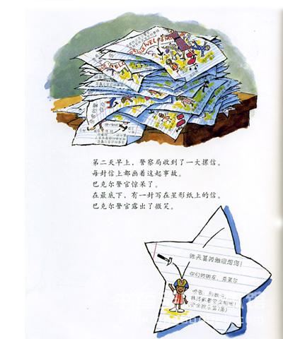 亲和有趣的安全标识——书中的星形贯穿全书:巴警官胸前佩戴着,葛芮雅脖子上也挂着,克莱尔的信是星形的,书的封底上巴警官和葛芮雅站在星形的舞台光影中谢幕!五角星是警徽的基本形状,警徽给人们安全可信的感觉,同时不失严肃。作者赋予了星形可亲可爱的感觉,更加贴合孩子的内心世界。看了这样一本书,孩子们一定会对星形警徽产生亲切感和认同感。不但如此,画家还创作出儿童世界的安全符号——“禁止乱扔香蕉皮”的标识,一开始,只有巴警官的袖章佩戴着这个醒目的标识,随着巴警官和葛芮雅的演讲越来越成功,这个安全标识在学生们中间流行起来,到最后一页,几乎每个学生的身上都佩戴着这个标识了。这个标识是那么富有童心,有多少孩子曾经被香蕉皮滑倒,所以不用文字解释,孩子们一看就明白了,还能举一反三:不要乱扔西瓜皮、不要乱扔口香糖……