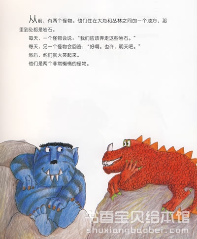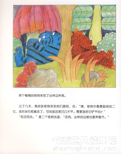 这个故事从表面上看,是在讲两个怪物不仅自己懒惰,而且自以为聪明,可以任意支使那个黄皮肤怪物为他们效力,结果却失去了自己土地上许多美好的东西。而黄皮肤怪物却任劳任怨,凭着自己默默而执著的劳作,终于创造了属于自己的新世界。——对于一般的绘本读者,尤其是小读者来说,只要明白了故事的这一层意思,也就可以说是完成了基本的“阅读任务”了。