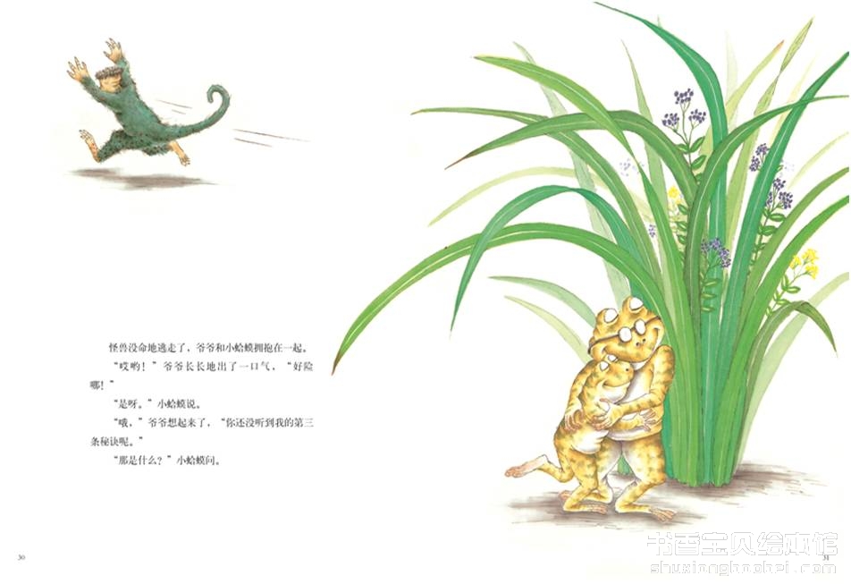 小蛤蟆和爷爷在林中散步。蛤蟆爷爷告诉小蛤蟆:这个世界充满了饥饿的敌人。该如何来应付呢,蛤蟆爷爷教小蛤蟆要勇敢和机智。有一天,来了一个庞然怪兽,眼看着爷爷就要成为他的美餐了,小蛤蟆该怎么办呢?