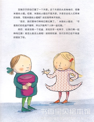 两个小女孩被分到一组一起种向日葵时,她们很不开心,所以花儿长得不好。“向日葵好像不高兴呢。”老师告诉她们说。于是,孩子们决定做一个天使来守护向日葵。随着向日葵越长越高,她们也学会了欣赏对方,友谊也在不知不觉中培养起来了呢。