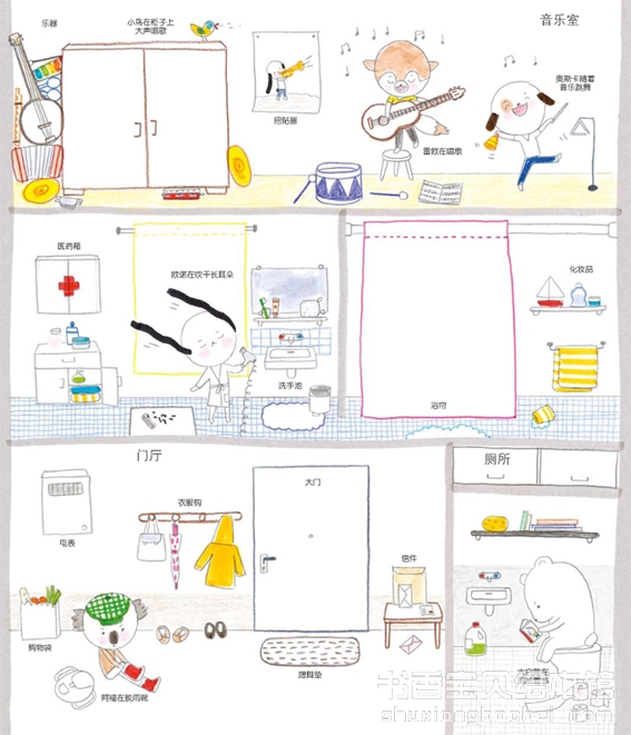 你手上的这本书,是一本看图识字书:从工作室到衣帽间,从地下室到阁楼,在每一个房间里,好好看,慢慢找,翻开每个小窗口……你会找到家里所有东西的名字,当然还有一些小惊喜:比如一只很占地方的大白熊,或是欧诺喜欢吃的小零食。