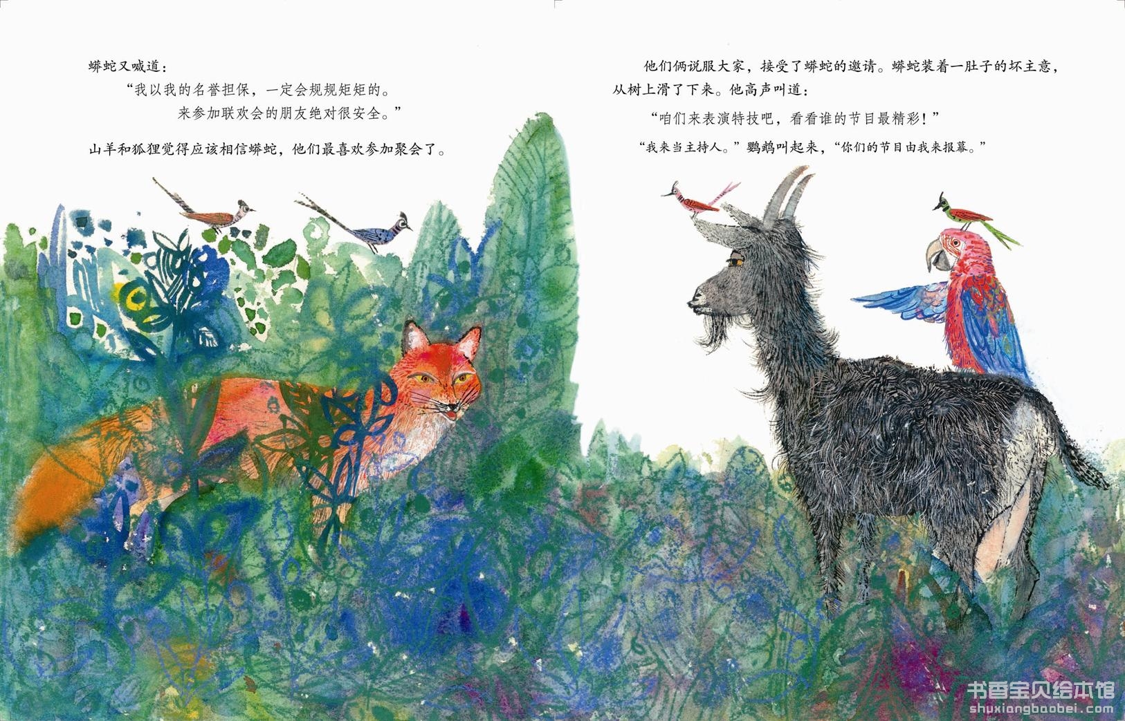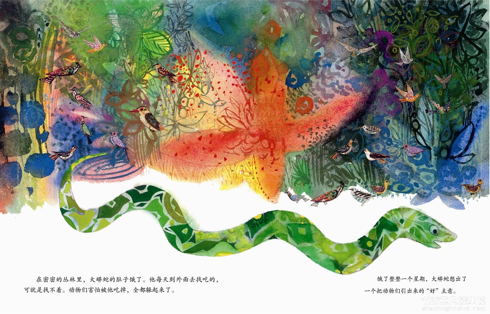 森林里,一条大蟒蛇肚子饿了。他想举办一场聚会,把动物们都骗出来。动物们果然上当了!他们高兴地前来参加聚会,土狼表演脚踩西瓜行走二十码,狮子大王给大家出哑谜,斑马用后蹄耍着三个椰子……节目真是太精彩了。蟒蛇终于等到机会出来表演节目,他竟然用诡计把动物们都吞进了肚子了。是谁救出了大家?动物们又说什么了?