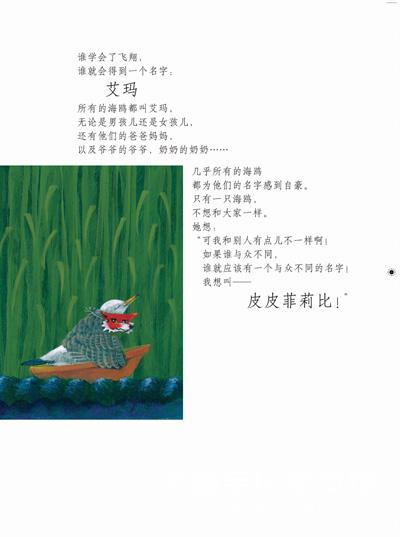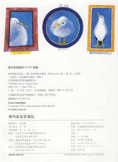 读图就是一种寻胜探幽,更需一双明敏的眼睛,不放过任何一幅幅大大小小的画面。当皮皮菲莉比告别图图,送他一根柔软、闪光的羽毛,请你仔细找找,那根羽毛在哪儿?当你看完全书,我建议你再从封面开始重新浏览一遍,你会对封面的那幅特写画有新的理解。就是蝴蝶页上那众多飘飞的白羽毛,也会把你再一次带上云天,和皮皮菲莉比比翼双飞……