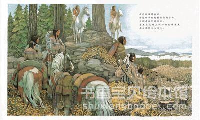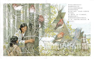 作者苏珊更费力仔细描绘生长繁茂的树枝花叶,使栩栩如生的森林、草原景象犹如在阅读者眼前出现,使读者能更贴近故事的时空;还刻意让人兽交错出现在枝叶其间,表示彼此在生活空间上的关系绵密相依,营造出天地间万物必须和谐并存的意象。这样细腻的生态关系描绘,有助于生活经验有限的孩子认识和了解大自然,体会生命的奥秘。