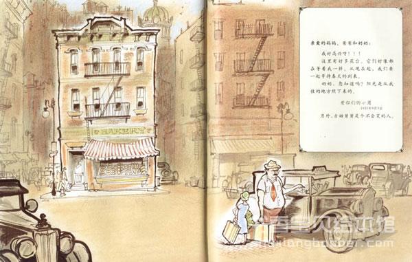 小恩提着两箱行李,经过了两天的火车行程,终于来到了舅舅生活的城市。整个灰色的世界直扑小恩而来。小恩抬起头四处张望,灰色的钢筋水泥,灰色的天窗门洞,灰色的人影和行踪。整本图画书翻阅一遍,就知道这一页的意味深长——除了小恩身上稚嫩的充满了春天气息的色彩,这个页面都是灰色的。而此前和此后,小恩的乡村生活和城市生活,在画家的笔下都是色彩饱满的——这个陌生世界的呈现犹如一个休止,一个转折,充满了不可知不可测。可是,小恩的发愣只是一瞬间的事情。当天,小恩给亲爱的妈妈、爸爸和奶奶的信中写道:“我好高兴呀!!!这里有好多花台,它们好像都在等着我一样。……阳光是从我住的地方照下来的。”这些花台为什么没有种花呢?按照一个人的寻常思维,那是多么沮丧啊。可是,亲爱的小恩不这么认为,她兴奋得不得了,她觉得花台们好像在等着她的来临……小恩之所以是小恩,那是因为她有这样的一种本事,把现实的灰色分解成为多彩的梦幻。她天生是一个乐观主义者。我现在有点怀疑,阳光并不是从小恩住的地方照下来的,而是小恩本身就有着一种生发阳光的能量。