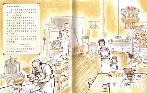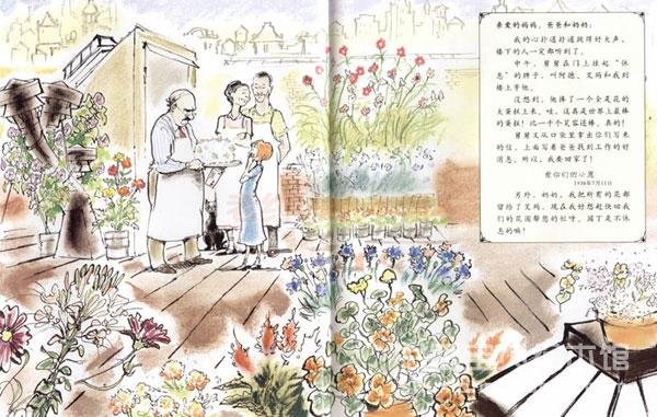 故事的行进是愉快的,如沐春风的。尽管舅舅不苟言笑,尽管刚来的时候小恩并不会为舅舅的面包店做面包。可是,小恩有信心把舅舅变成一个会笑的人,她写长诗给舅舅,与舅舅的朋友阿德和艾玛成了朋友,她还学会了揉面包……最重要的,她发现了一个只有一只叫做欧提的猫才知道的秘密基地,她有了一个伟大的计划,要把这个天台变成一个秘密花园……舅舅的面包店越来越美丽了,店前、店里,几个楼层的花台上都种满了美丽的花,顾客们除了来店里买面包,还会对这些花驻足观看,甚至,还把家里刚长出来的小植物送到小恩这里来。儿子看着图画书告诉我,邮差给小恩送完信也不舍得离去呢。