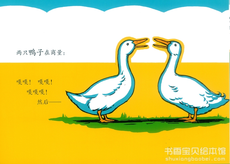 从前有一只小狗,他的名字叫安格斯。他是一只好奇心极强的小狗,他最想知道的,就是绿树丛那一端是谁在整天“嘎嘎”地叫个不停。一天,门开着,它趁机冲了出去,钻过矮树篱笆一看,原来是两只雪白的鸭子。它冲着鸭子叫起来,吓得鸭子转身就逃。可追着追着,想不到两只鸭子调过头来追起它来了。