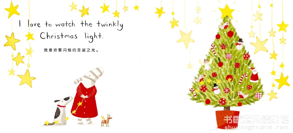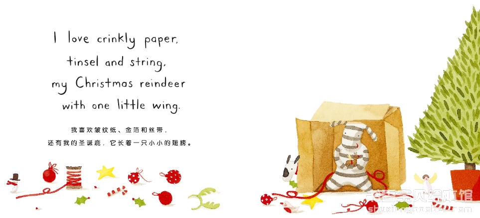 我叫欧利耶,我爱圣诞节。我喜欢皱纹纸、金箔、丝带、一只翅膀的圣诞鹿。我最喜欢……温馨有趣的双语绘本。