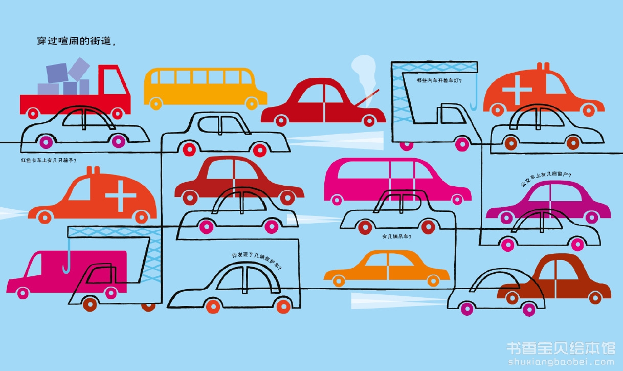 《跟着线走》描绘了日常生活中常见的街道、街道上的行人、信号灯、海上的船,海里的鱼、天空、森林、动物、房子里的人……在跟着线旅行的同时,练习数数,认识颜色,发现差异、认知事物。