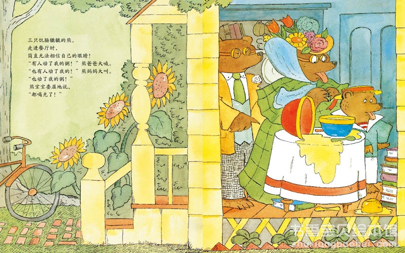 早晨,出去兜过风的熊爸爸、熊妈妈和熊宝宝饥肠辘辘。当他们回到那个维多利亚式的漂亮家时,目瞪口呆!晾在餐桌上的粥被喝掉了。熊宝宝的椅子散了架。楼上呢?入侵者还在呼呼大睡。谁能想到,一个小丫头能带来这么混乱的局面?