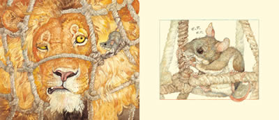 《狮子和老鼠》也被称作《狮子和报恩的老鼠》,出自世界上最早的寓言故事集《伊索寓言》。这部作品原本的故事是这样的——狮子睡着了,有只老鼠跳到了他身上。狮子猛然站起来,把他抓住,准备吃掉。老鼠请求饶命,并说如果保住性命,必将报恩,狮子轻蔑地笑了笑,便把他放走了。不久,狮子真的被老鼠救了性命。原来狮子被一个猎人抓获,并用绳索把他捆在一棵树上。老鼠听到了他的哀嚎,走过去咬断绳索,放走了狮子,并说:“你当时嘲笑我,不相信能得到我的报答,现在可清楚了,老鼠也能报恩。”