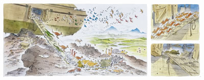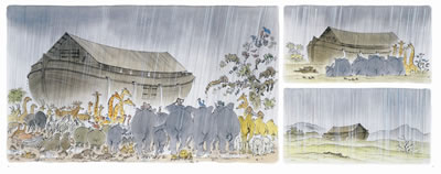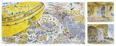 彼得?史比尔大量地运用分割画面,将一个个动作分解在一个个小图之中。你看诺亚让一对对动物上方舟这场戏,两个跨页,大大小小一共八幅图,连起来一看,整个过程清清楚楚地被还原出来了。