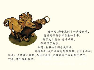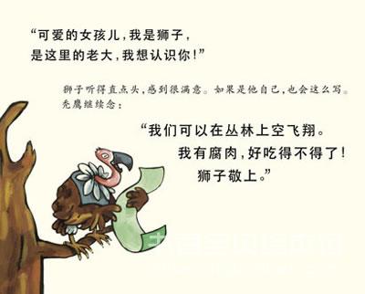 狮子只是想写信告诉母狮子,她有多么美丽,告诉她,多么想见到她,想和她在一起,懒洋洋地躺在树底下——这才是狮子的世界。没有任何动物可以体验、取代。故事有一个温馨的结尾,虽然狮子不会写字,但母狮子还是懂得了他的钟情。