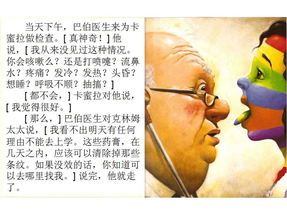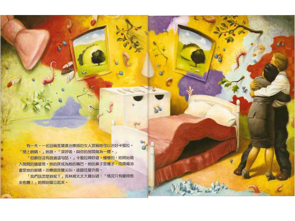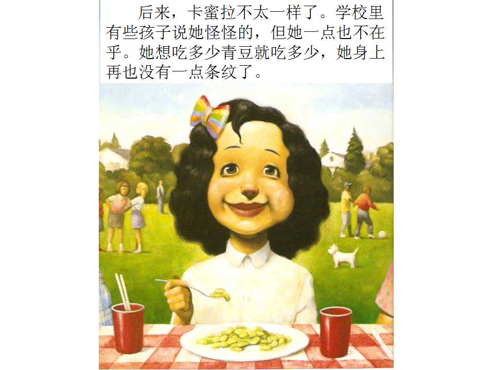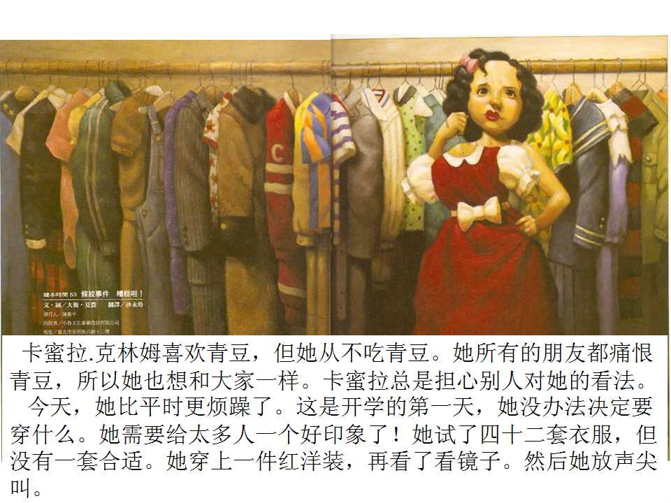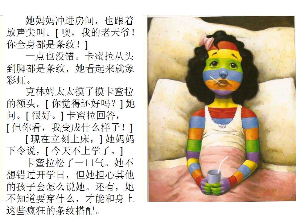 内容简介:这本《糟糕,身上长条纹了!》用夸张的故事情节和色彩搭配,讲述了一个小姑娘如何寻找自我的故事。小主人公卡米拉是一个很注重别人看法的孩子,虽 然喜欢吃青豆,但因为别人不喜欢,所以她也不吃。开学第一天,为了引起同学们的注意,换了几十套衣服也不满意。由此开始发生奇怪的事情。