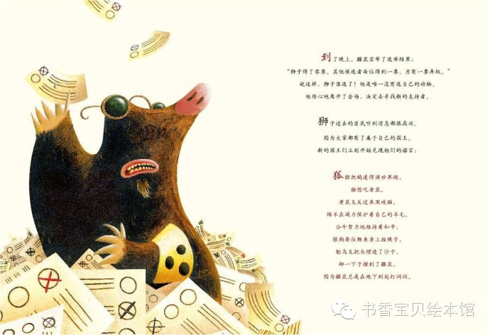 到了晚上,鼹鼠宣布了选举结果:“狮子得了零票。其他候选者每位得到一票,另有一票弃权。”