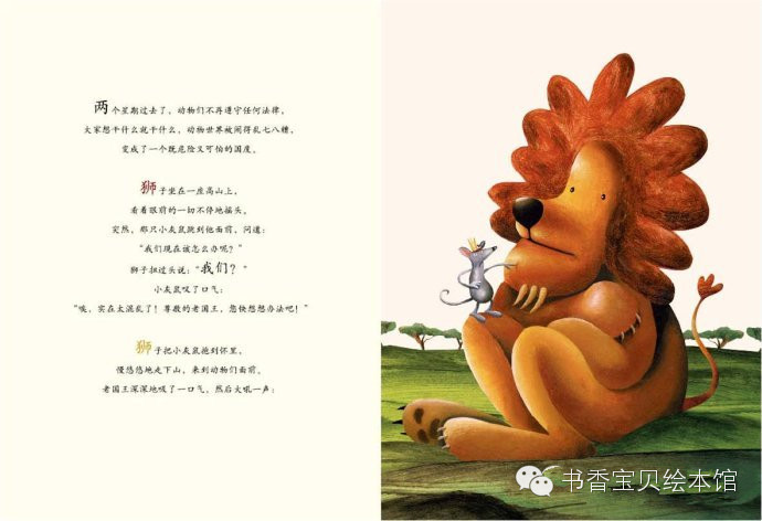 狮子坐在一座高山上,看着眼前的一切不停地摇头,突然,那只小灰鼠跳到他面前,问道:“我们现在该怎么办呢?”