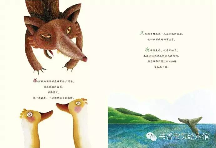 狐狸认为国家不应该有什么国界,他主张取消国家,不要国王,他一边说着,一边朝鹅眨了眨眼睛。