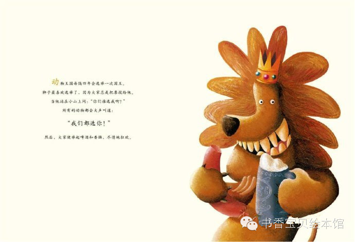 就这样,狮子落选了!他是唯一没有选自己的动物。他伤心地离开了会场,决定去寻找新的支持者。