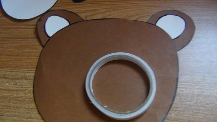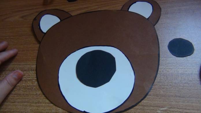 在棕色卡纸上画出熊圆圆的头和圆圆的耳朵,在白色卡纸上画出圆形的熊嘴巴和两个熊的内耳,在黑色的卡纸上画出熊圆圆的大鼻子和两个圆形的眼睛。