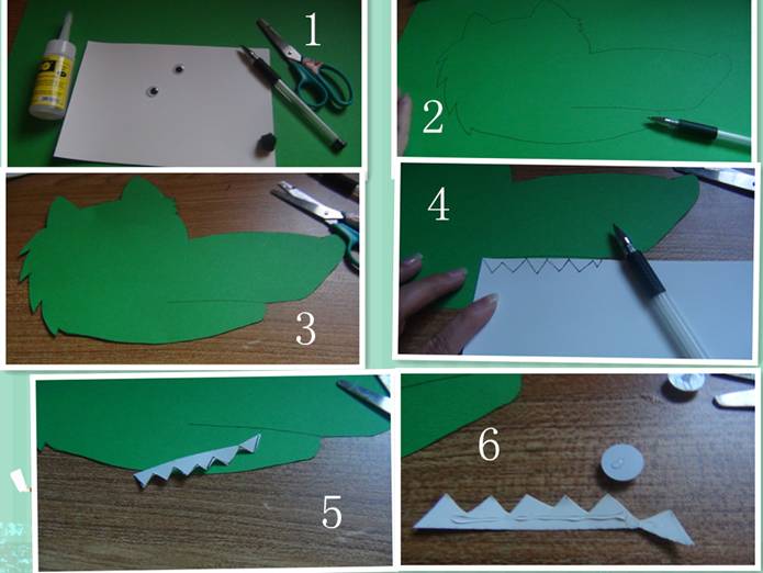 画出小绿狼的外形,剪下来,画出牙齿线,把白色卡纸比在牙齿线上画出锯齿线。剪下来,在活动的眼珠上面涂上胶。