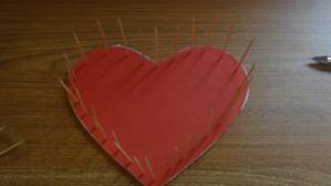 1把心形剪下来,涂上胶水粘贴到板子上,把板子用刀也画成心形,先用笔画出扎孔的位置,并用牙签扎出小孔如下图。