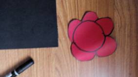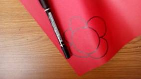 在红色卡纸上画出花朵,用剪刀剪下来,背面贴上双面胶。