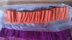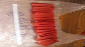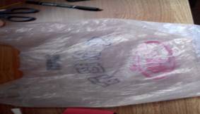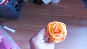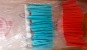 准备:1笔、剪刀、双面胶、若干皱纹纸、红色黑色卡纸还有一般的超市购物袋