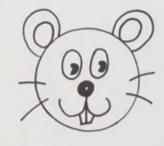 5、在耳朵里面分别画小圆,在嘴唇下面画两颗牙齿,最后在大圆的左右两边分别画两条斜线,老鼠就画好了。