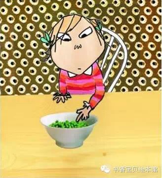 接着,萝拉看见了盘子里的豌豆。“我不吃豌豆。” 萝拉说。我解释说: “这些当然不是豌豆, 它们是从绿色王国来的绿色圆球,它们是用绿色的东西做成, 然后从天上掉下来的。”