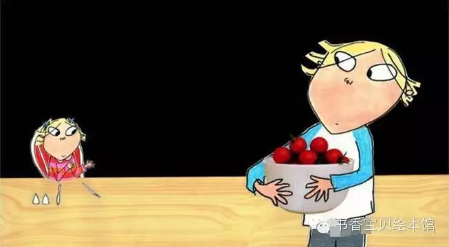 萝拉说:“查理哥哥,就是那个东西。”我几乎不能相信自己的眼睛,猜猜萝拉会指着什么呢?她正指着番茄!我问:“真的吗?你真的要吃个番茄?”