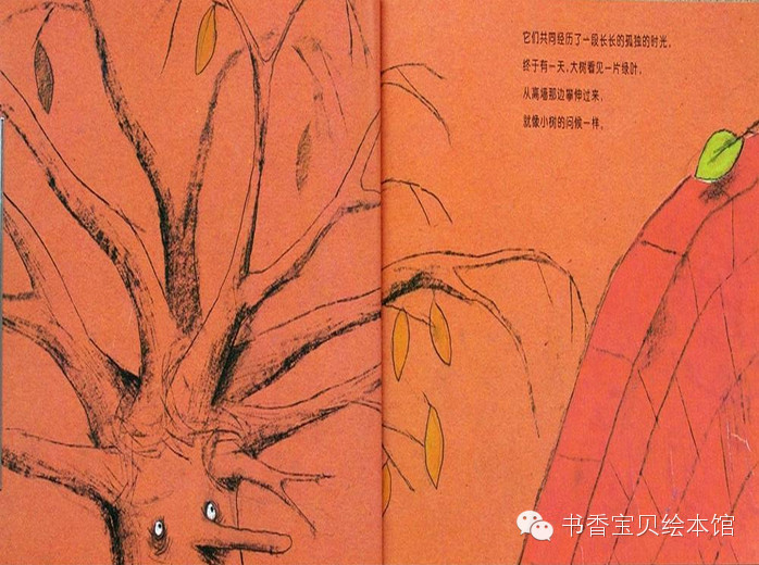 它们共同经历了一段长长的孤独的时光,终于有一天,大树看见一片绿叶,从高墙那边攀伸过来,就像小树的问候一样。