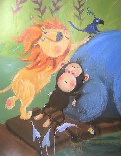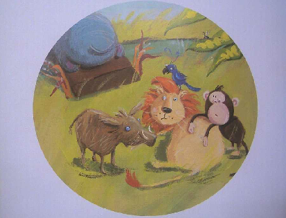 猴子和狮子来到睡觉的河马身边。