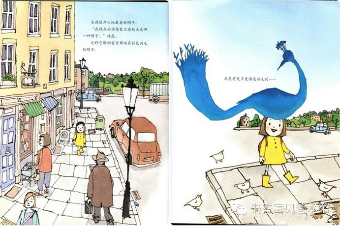 橱窗里有许多帽子,她最喜欢的插着彩色羽毛的帽子!