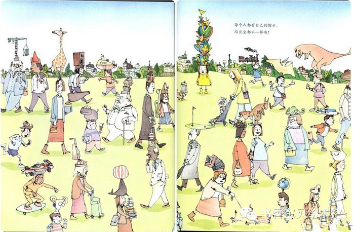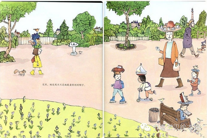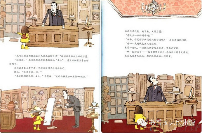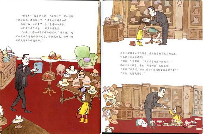 除了和米莉一起经历美好有趣的想象力之外,书中店员的态度非常值得一提;一脸正经八百的店员,穿西装、打领带,站在高级精品店的柜台后面,令人望而止步;店员不但有童心,而且懂得尊重小小的消费者。当然,米莉的妈妈也很配合,明明没有看到米莉头上有任何帽子,却突然会心一笑,希望自己也有一顶和米莉一样的神奇帽子,这是肯定米莉的想象力。观察和想象力是开发智力的最佳途径,祝福你和孩子一面读绘本,一面开心地发挥想象力哦!你想戴哪一种帽子?